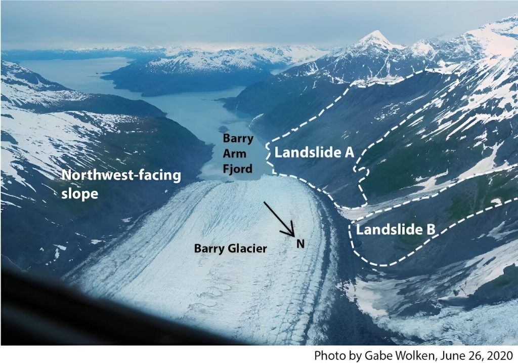 Encostas afetadas por deslizamentos de terra ao redor do fiorde Barry Arm, Alasca. Se as encostas desabarem repentinamente, cientistas temem que um grande tsunami atinja a cidade de Whittier, a 48 km de distância. Crédito: Gabe Wolken / USGS