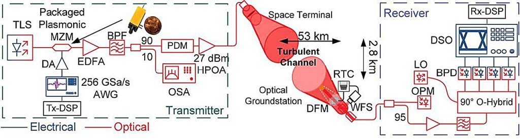 Em experimentos ópticos de espaço livre ao ar livre, os pesquisadores alcançaram taxas de informação de até 424 Gbit/s abaixo de um limite de 25% SD FEC — o ponto em que um sistema ainda pode corrigir erros em dados transmitidos, apesar de interferência ou ruído. Experimentos usando um modulador IQ plasmônico em um sistema de fibra padrão alcançaram uma taxa de transferência ainda maior de até 774 Gbit/s/pol, permanecendo abaixo de um limite de 25% SD FEC.
