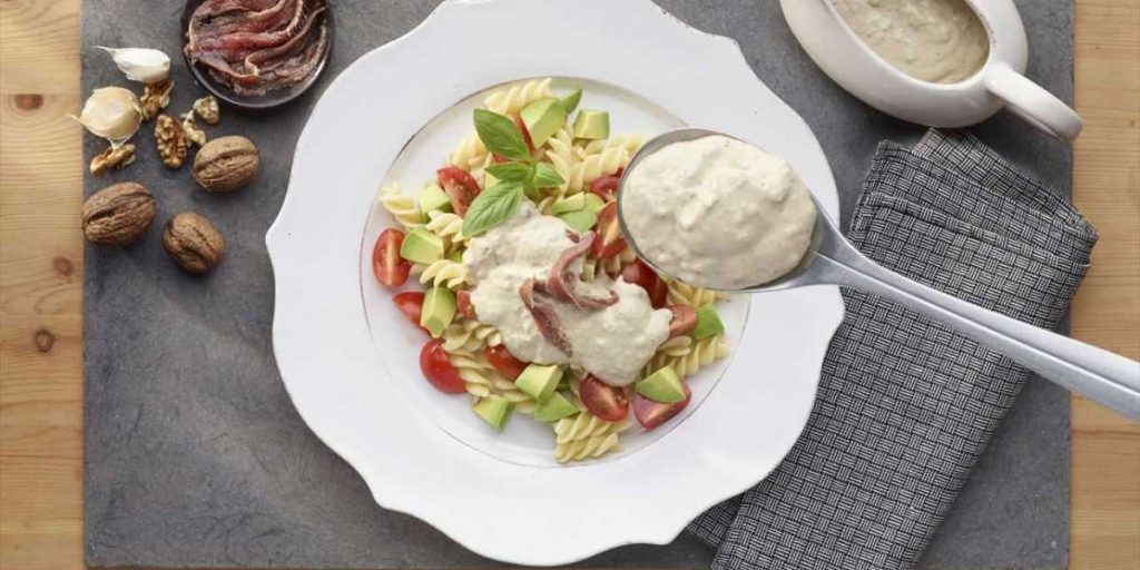 Amasse as anchovas num pilão com os 2 dentes de alho e as nozes. Adicione a mostarda e a maionese, misture bem. Despeje o leite junto com o whey e tempere com pimenta. Sirva sobre algumas folhas de salada espiral com tomate cereja e abacate em cubos.