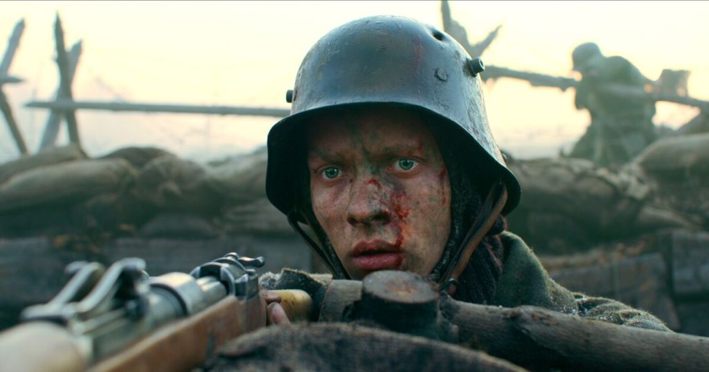 Em “Nada de Novo na Frente Ocidental”, do diretor Edward Berger, o soldado Paul Bäumer (Felix Kammerer) é encontrado em uma pilha de escombros por seus camaradas, tendo sobrevivido a uma noite de bombardeio inimigo. Conforme ele ganha consciência, os sons abafados da guerra – particularmente os gritos de homens feridos – se infiltram na paisagem sonora. Ele é rapidamente colocado para trabalhar coletando placas de identificação dos mortos. Ouvimos um barulho a seus pés. É um par de óculos. Ao pegá-los, a respiração de Paul acelera, a atmosfera ao seu redor diminui. Ele vira um corpo deitado de bruços na lama. É o amigo dele. As lágrimas escorrem pelo rosto de Paul enquanto ele arruma o uniforme desgrenhado em busca de palavras para se despedir. Eles nunca vêm. Uma partitura melódica fervente para abruptamente quando alguém grita para ele continuar se movendo. É o segundo dia de Paul na guerra.