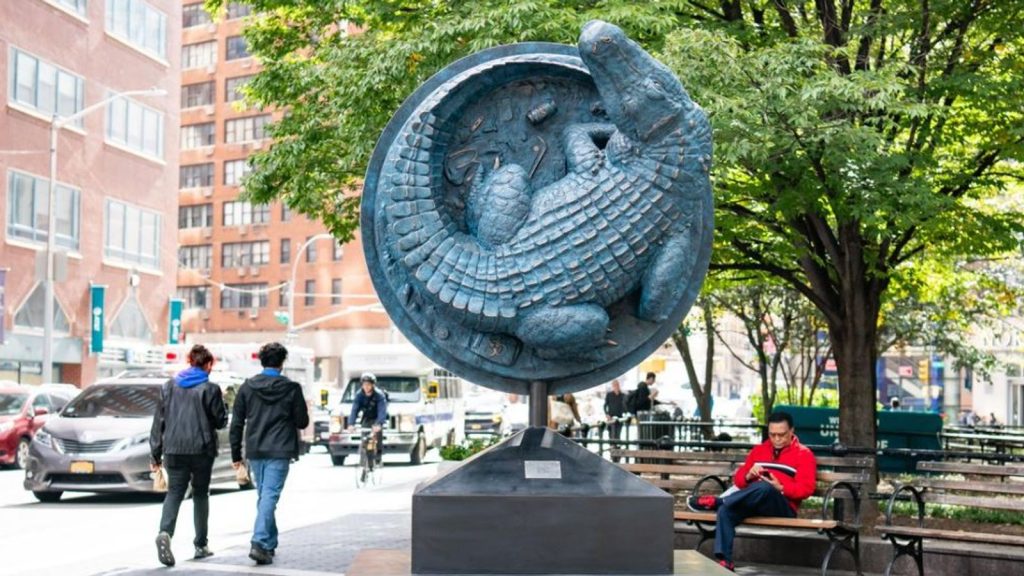 A escultura de bronze, chamada NYC Legend, foi inaugurada no Union Square Park pelo artista sueco Alexander Klingspor e presta homenagem à “capacidade duradoura da cidade de Nova York de se adaptar e sobreviver” – uma qualidade “incorporada pelo crocodilo”.