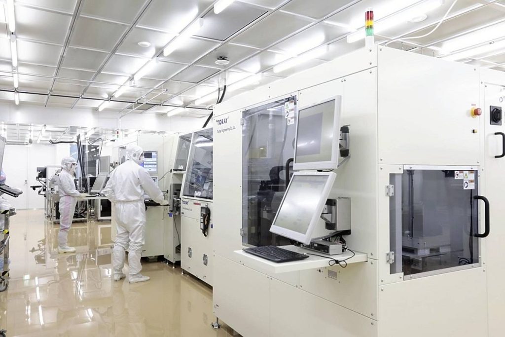 Pesquisadores são vistos em uma sala limpa desenvolvendo tecnologias para o processo de back-end na fabricação de semicondutores.