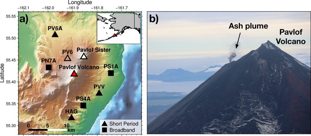 (a) Mapa da estação da rede sísmica e infrassônica do Observatório de Vulcões do Alasca no Vulcão Pavlof. Todas as estações sísmicas têm um sensor infrassônico colocalizado. Observe que a estação PV6 foi destruída durante a erupção de 2016 e é mostrada para referência porque estava operacional durante as erupções de 2007, 2013 e 2014. O mapa inserido mostra a localização do Vulcão Pavlof ao longo da Península do Alasca. (b) Vista de helicóptero de uma pequena explosão de cinzas da abertura ativa do Vulcão Pavlof em 26 de agosto de 2022. As aberturas para a erupção de 2021–2022 estavam localizadas no flanco sudeste superior do vulcão em relação ao cume. Crédito: Valerie Wasser, University of Alaska Fairbanks