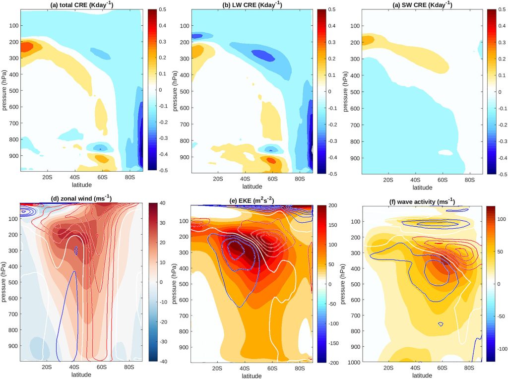 A análise cruzada de EOF revela ainda o papel obstrutivo do CRE interativo no modo de propagação do vento zonal SH, tanto diretamente através da fonte de onda do CRE quanto indiretamente através da modulação de outros processos diabáticos. Como resultado, o modo de propagação se torna mais persistente e o SAM que ele representa se torna mais previsível quando o CRE interativo é desabilitado.