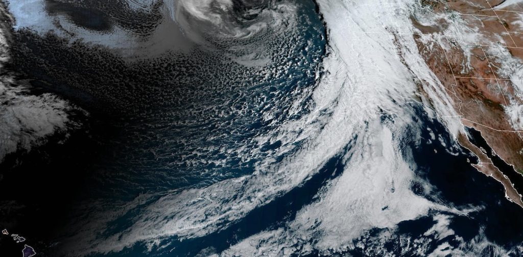 Ao longo da costa oeste dos EUA, o Oceano Pacífico serve como reservatório de humidade para a tempestade e as cadeias montanhosas funcionam como barreiras, razão pela qual os lados ocidentais das cadeias costeiras e a Serra Nevada vêem tanta chuva e neve.