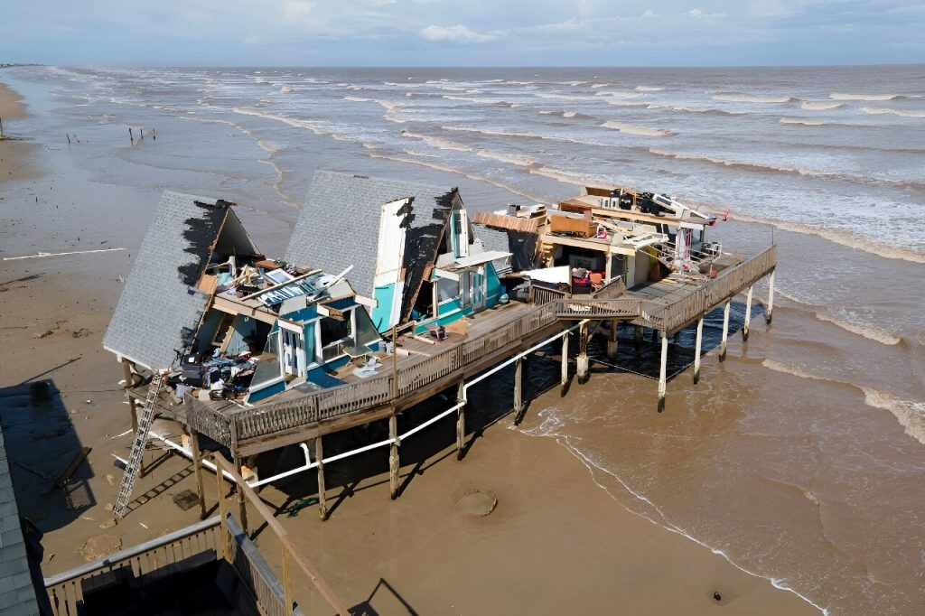 Uma vista aérea mostra uma casa destruída à beira-mar em Surfside Beach, Texas, depois que o furacão Beryl atingiu a costa.
