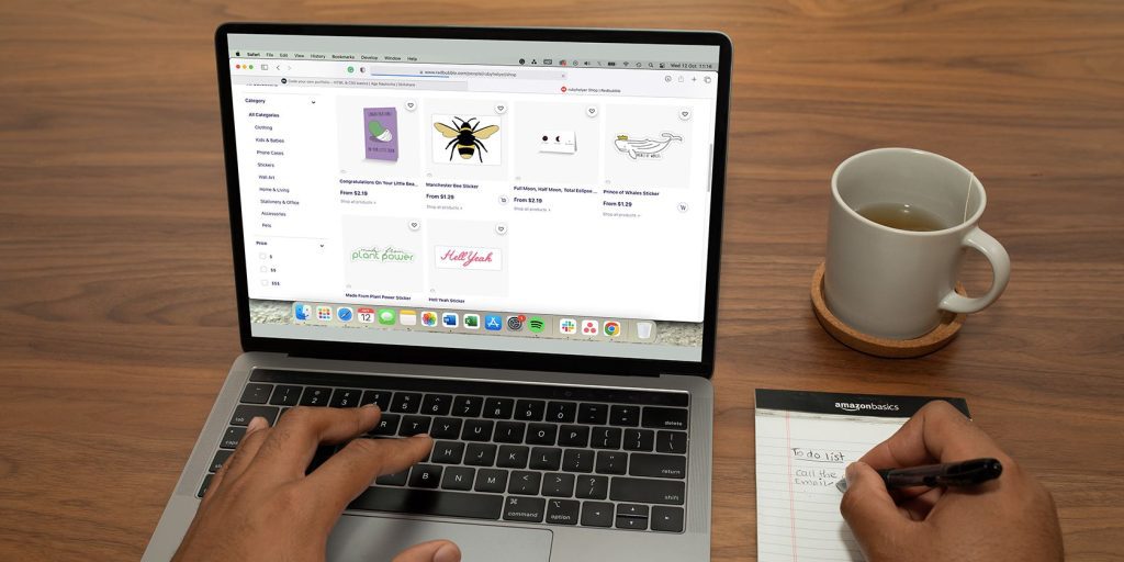 RedBubble é um mercado online onde você pode fazer upload de seus designs e ilustrações. Também oferece uma variedade de produtos físicos aos quais você pode adicionar seus designs. Você não precisa se preocupar em armazenar os produtos, o site funciona como um serviço de impressão sob demanda.