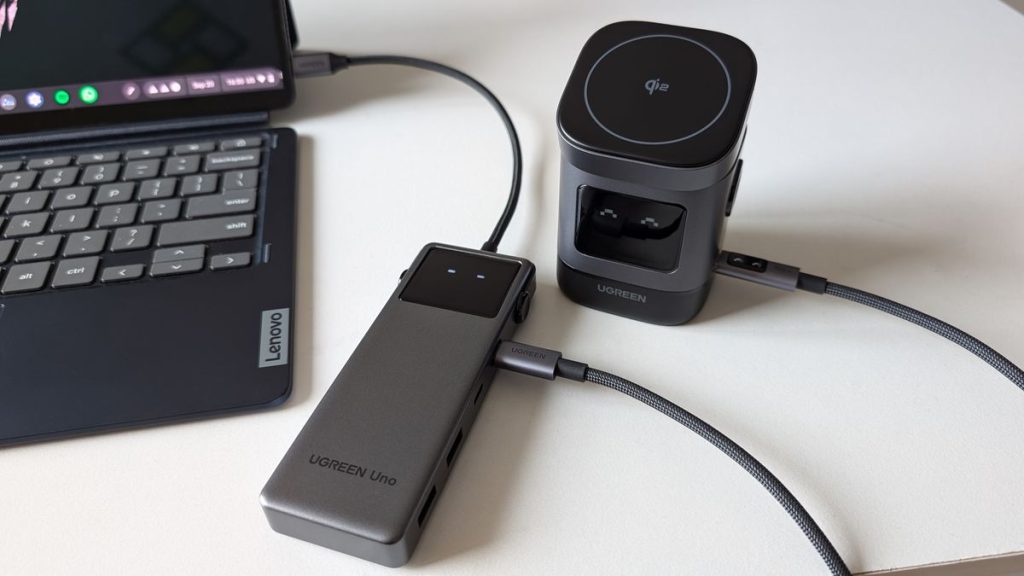 Embora não seja um carregador, ele pode ser usado como um por extensão quando conectado a um laptop ou Chromebook. O UGREEN Uno 6 em 1 USB-C Hub é o companheiro perfeito para Chromebooks, notebooks e todos os outros PCs que não têm portas suficientes. Como uma assinatura da série UGREEN Uno, este hub tem um display LED que acende com um sorriso quando em uso.