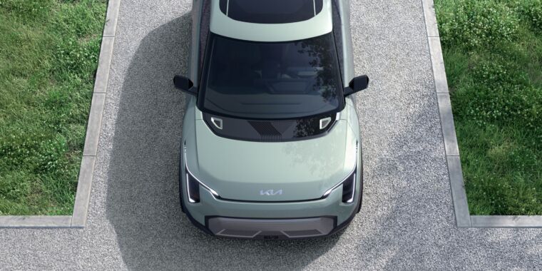Por dentro, o EV3 possui alguns recursos sofisticados, incluindo um painel deslizante para os controles climáticos e peças de acabamento retroiluminadas que são móveis, direcionando o fluxo de ar das aberturas fixas. Mais significativamente, o EV3 tem um banco traseiro rebatível que permite aos clientes utilizar o piso de carga plano. A Kia ainda diz que espera equipar o EV3 com uma tomada interna de veículo para carga (V2L), para que você possa, digamos, carregar uma e-bike e carregá-la enquanto dirige. Isso não é apenas pensamento conceitual – a Kia está tentando colocar isso em produção.
