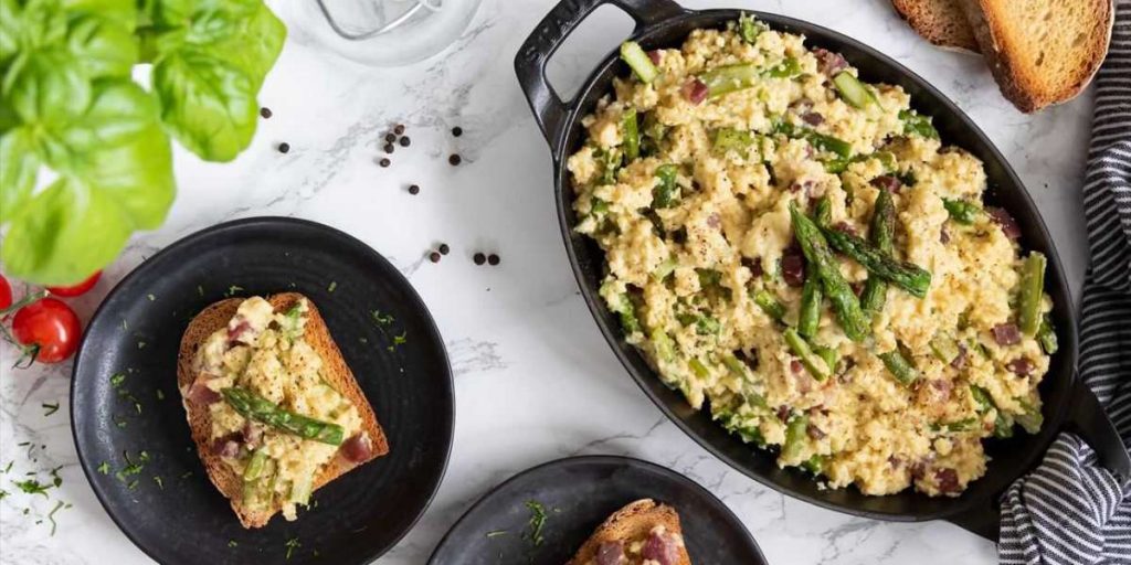 Corte as pontas dos espargos.Corte o resto dos aspargos no sentido do comprimento e corte em pedaços pequenos. Pique o alho e a cebola. Aqueça duas colheres de sopa de azeite em uma frigideira e cozinhe em fogo médio por cerca de 10 min, mexendo ocasionalmente. Adicione os aspargos verdes e cozinhe por cerca de 10 min em fogo médio, mexendo. Adicione os ovos batidos misturados com o leite e o whey. Cozinhe em fogo médio-alto por 3-4 min, mexendo continuamente e tempere a gosto.
