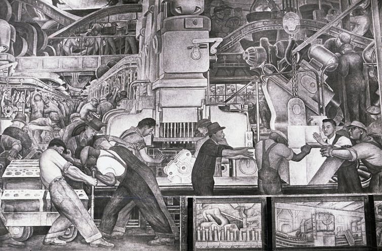 Num esforço para resolver a mancha na sua imagem pública, a família Ford primeiro encomendou e depois expandiu uma grande obra do muralista mexicano Diego Rivera que se tornaria a peça central do Instituto de Artes de Detroit, conhecida como Mural da Indústria de Detroit. Rivera, um conhecido comunista, retratou tanto a eficiência implacável como a desigualdade racializada do processo industrial.
