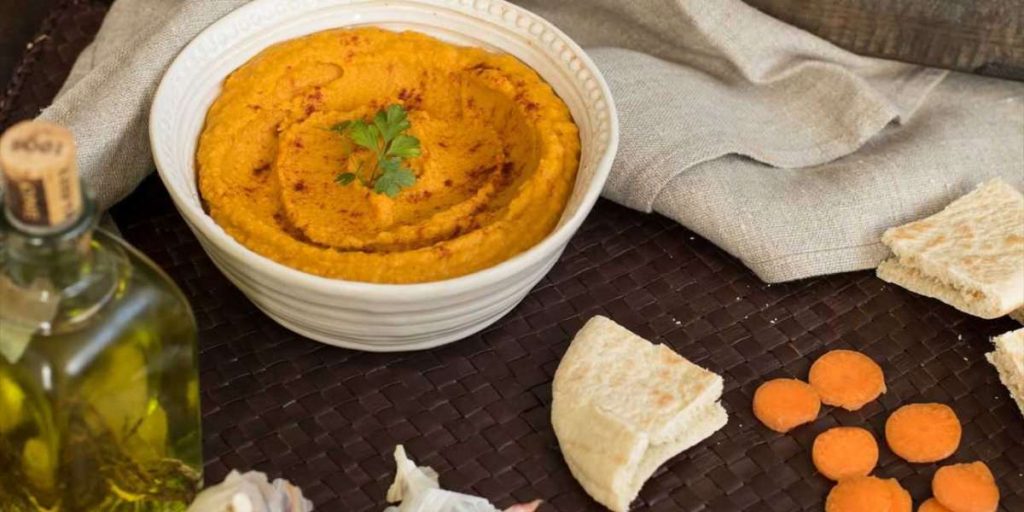 Ferva a cenoura descascada e picada no leite com whey por 10 minutos. Escorra reservando ao leite.Coloque a cenoura e o grão de bico no copo do liquidificador. Junte o azeite, o sumo de limão, uma pitada de colorau e o caldo de legumes.Bata até obter um creme fino e homogêneo (adicione mais leite reservado se for muito consistente). Sirva em uma tigela para espalhar.