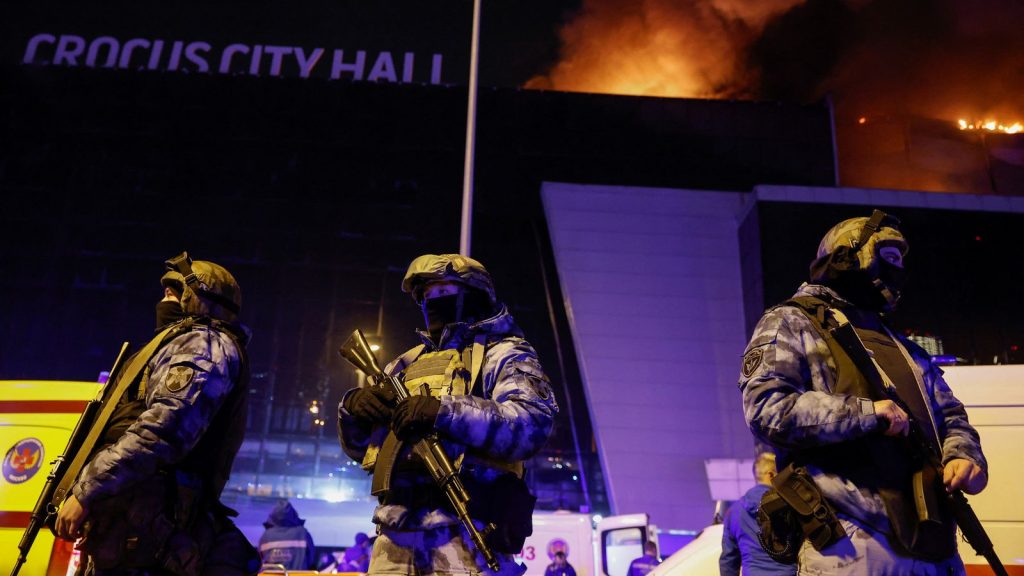 Os homens armados, vestindo uniformes de combate, também causaram um grande incêndio na Prefeitura de Crocus.