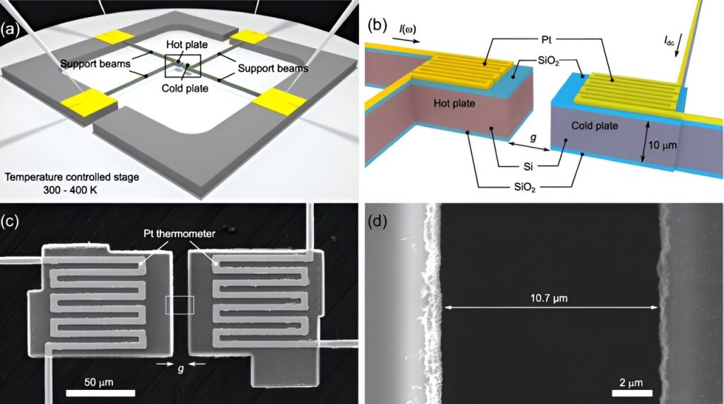 Plataforma experimental usada para sondar a transferência de calor radiativo. (a) Esquema de duas microplacas de Si suspensas por vigas de 706 μm de comprimento e montadas em um estágio de aquecimento controlando sua temperatura. (b) Diagrama das placas quentes e frias revestidas com SiO2 nanocamadas e separadas por um intervalo de vácuo g=10,7μm. Imagem de microscópio eletrônico de varredura do (c) dispositivo e (d) seu close-up na caixa retangular em (c). Crédito: Cartas de revisão física (2024). DOI: 10.1103/PhysRevLett.132.186904