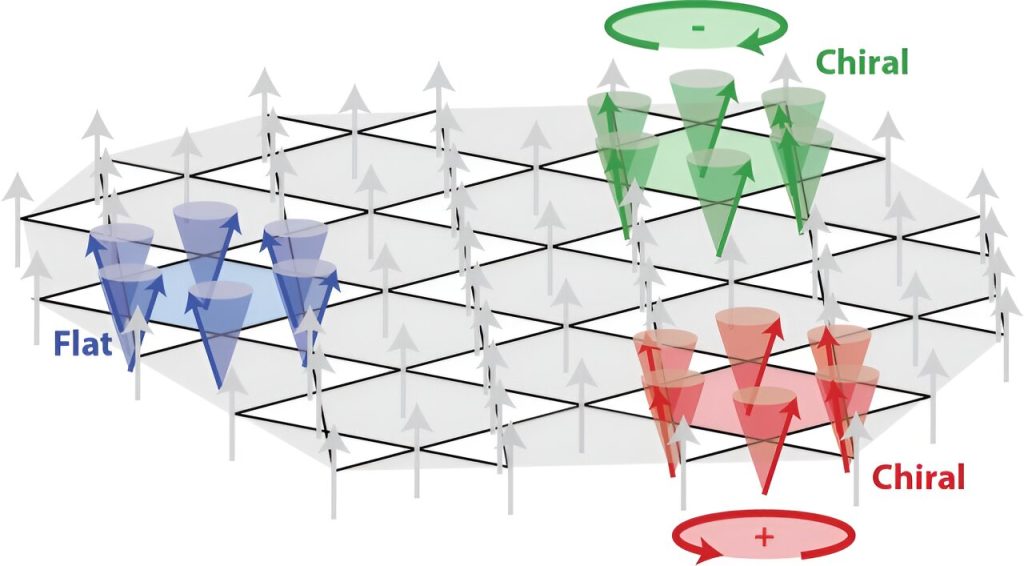 Pesquisadores do Laboratório Nacional Ames do Departamento de Energia dos EUA descobriram uma excitação quiral inesperada no ímã topológico em camadas kagome TbMn6Sn6. Esta excitação quiral pode ser vista como um redemoinho ou vórtice magnético localizado. A equipe também confirmou a existência de magnons de banda plana localizados, uma nova excitação associada à frustração da geometria da rede Kagome.