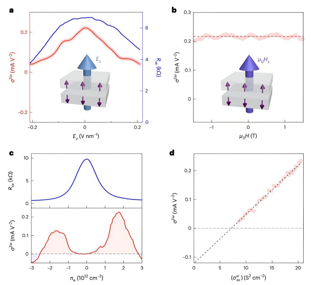 Investigações sistemáticas do efeito do diodo antiferromagnético intrínseco. a, Condutividade não linear σ2ω e resistência longitudinal Rxx como funções do campo elétrico vertical Ez. b, Condutividade não linear como uma função do campo magnético vertical μ0Hz no estado AFM. A linha tracejada vermelha é a linha média de σ2ω. c, Resistência longitudinal medida experimentalmente (painel superior) e condutividade não linear (painel inferior) como funções da densidade de carga ne. As regiões σ2ω positiva e negativa são sombreadas em rosa e azul claro, respectivamente. d, Escala entre a condutividade não linear e o quadrado da condutividade linear regular. A linha tracejada escura é o ajuste linear à curva de escala. Crédito: Eletrônica da Natureza (2024). DOI: 10.1038/s41928-024-01219-8.