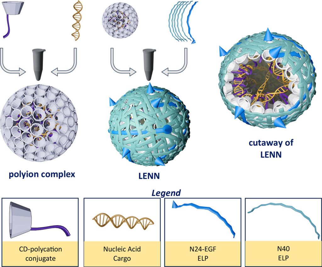 O núcleo interno do sistema LENN é feito de um complexo de ácidos nucleicos e ciclodextrinas modificadas — um produto do processamento de milho. Seu núcleo externo é a elastina, uma das proteínas mais abundantes no corpo. Thompson disse que o design fornece vários benefícios.