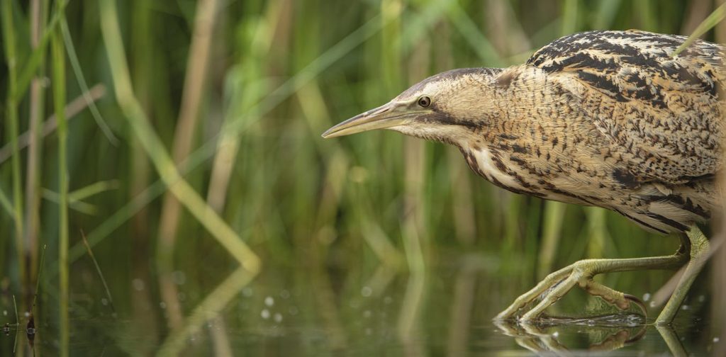 A garça eurasiana (Botaurus stellaris) é uma ave reclusa pertencente à família das garças. Quase do tamanho de uma galinha, os bitterns são uma mistura de marrom-dourado manchado com delicado preto e castanho. Com patas compridas e verdes e patas grandes, estas aves estão adaptadas a esgueirar-se pelos caniçais – os pedaços de zonas húmidas cobertos por densas manchas de caniçal comum – para caçar tranquilamente peixes e anfíbios.