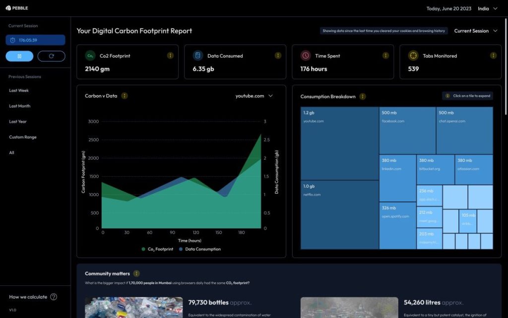 Talvez não consigamos mudar os nossos hábitos para minimizar a nossa pegada de carbono da noite para o dia, mas a consciencialização é o primeiro passo no longo caminho para a sustentabilidade. Pebble ajuda a conscientizar sobre nosso impacto no meio ambiente e como até mesmo as coisas mais simples, como assistir a vídeos ou navegar na web, contribuem para o aumento alarmante das emissões de carbono em todo o mundo.