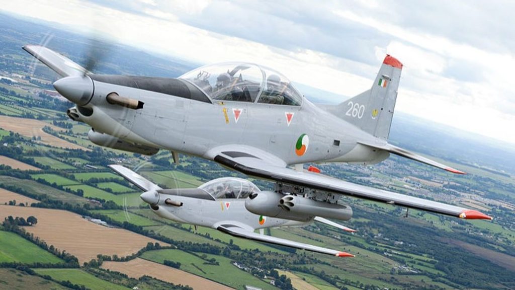O ex-capitão do Irish Air Corps Kevin Phipps, agora um piloto de linha aérea comercial, voou o único avião de combate da Irlanda, o Pilatus PC-9 de fabricação suíça.