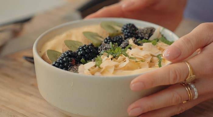 Em seguida, coloque a mistura do smoothie em uma tigela e coloque as coberturas de sua escolha – usamos kiwi fatiado, amoras, lascas de coco e sementes de girassol, mas você não pode errar com sua fruta favorita.
