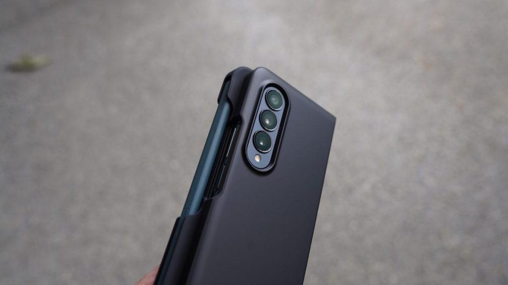 O Z Fold 4 fica praticamente plano, com exceção do conjunto de câmeras, quando totalmente aberto e colocado em uma superfície. Esse não é o caso do telefone envolvido no Slim Armor Pro. Agora há uma grande protuberância no meio, então o telefone balança neste braço.