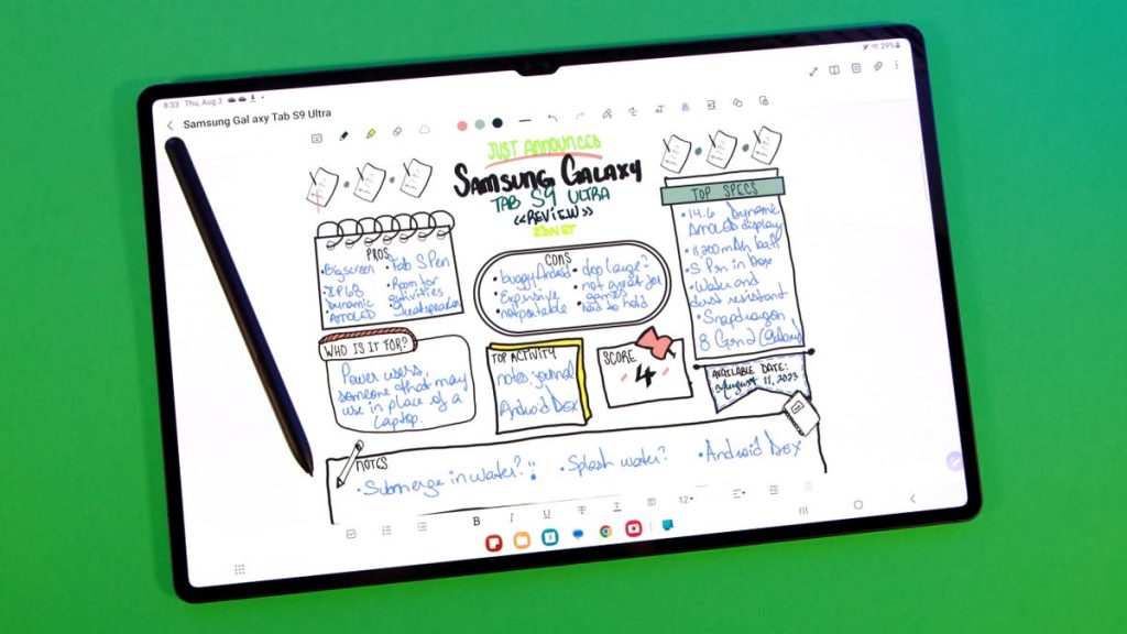 A Samsung lançou sete novos produtos durante o evento Unpacked, incluindo o Galaxy Tab S9 Ultra, o tablet mais sofisticado da empresa, com todos os recursos que você possa imaginar. O tablet de 14,6 polegadas é comercializado como um dispositivo premium capaz de lidar com a maioria, senão todas as tarefas que consomem energia – desde que o usuário esteja disposto a pagar o preço.