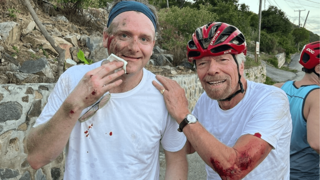 O fundador da Virgin disse que sofreu “uma grande queda”, postando uma foto no Instagram mostrando-o com um cotovelo sangrando ao lado de um colega ciclista que também sofreu uma lesão.