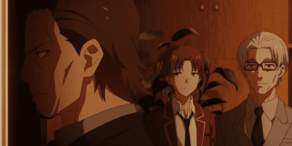 Os dois então discutem a situação com o mordomo que tirou sua vida depois de ser demitido por ajudar Kiyotaka a se matricular na escola. Seu pai compartilha sua vontade de querer que ele retire seu nome da escola e volte para a Sala Branca. Enquanto isso, o presidente da escola, Sr. Sakayanagi, se junta a eles e protege os interesses de Kiyotaka, dizendo a seu pai como a escola protege os interesses dos alunos. Seu pai não tem escolha a não ser permitir que Kiyotaka continue sua educação na escola.