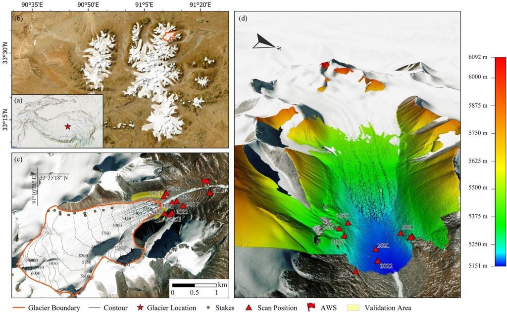Área de estudo; (a) Localização da geleira GLJM no Planalto Tibetano; (b) Geladaindong, parte nordeste é a geleira GLJM; (c) Geleira GLJM; (d) mostra a extensão da pesquisa lidar em 2022. Crédito: Revista Internacional da Terra Digital (2024). DOI: 10.1080/17538947.2024.2375527