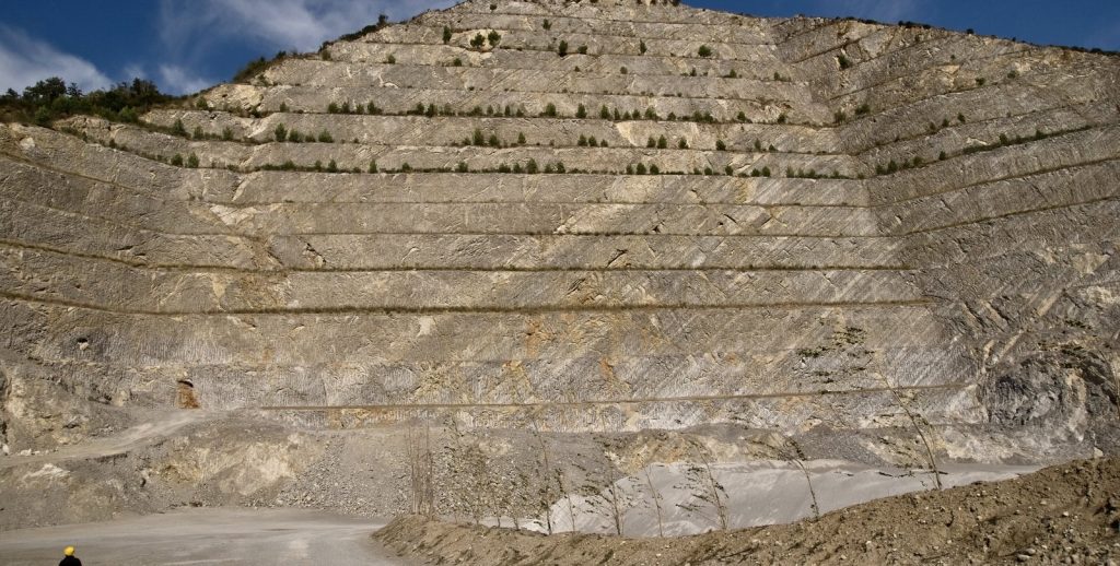 Uma pedreira ilustrando faixas de calcário estratificado do antigo fundo do mar no que hoje é o Mercato San Severino, na Itália. Crédito: F. Tissot