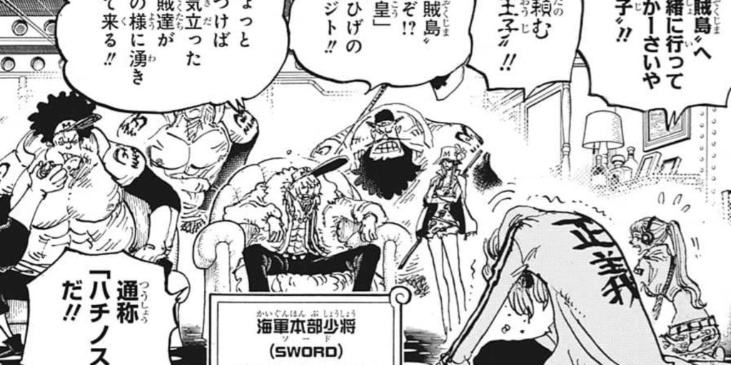 Corta para o presente, a força SWORD chega e ataca Hachinosu, e alguns de seus membros são apresentados. Primeiro, vemos o Comandante Hibari, que é um franco-atirador que usa as balas “GP Flower” de Vegapunk que podem transformar a pólvora do inimigo em flor. Em seguida, vemos o contra-almirante Kuchaku, que é neta do vice-almirante Tsuru.