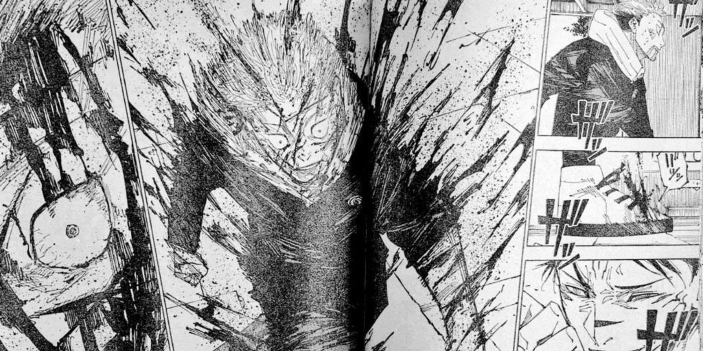 Yuji grita com Sukuna, explicando por que caras como ele não podem viver adequadamente e por que espalham a miséria. Sukuna usa seu ataque Cleave em Yuji e responde, por que os humanos são tão fracos e ainda se apegam tanto à vida? Seu ataque fere Yuji gravemente. Sukuna continua a repreendê-lo, afirmando que criaturas fracas como ele devem apenas mastigar a miséria que se ajusta à sua estatura por toda a vida. Isso enfurece Yuji, e ele responde: “Então tente mastigar um pouco de miséria para si mesmo”, após o que ele se move em direção a ele com raiva enquanto Sukuna corta seu corpo com o ataque de Cleave continuamente.