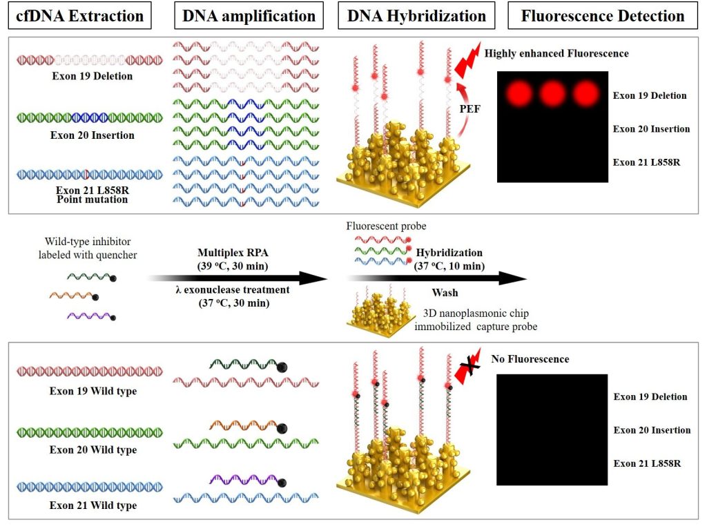 A equipe fabricou um biochip na forma de um microarray capaz de detectar simultaneamente três genes mutantes de EGFR (deleção, inserção e mutações pontuais) em um substrato plasmônico feito de nanoestruturas de ouro tridimensionais de alta densidade. Após avaliar o desempenho clínico de 43 pacientes domésticos com câncer de pulmão (estágios 1 a 4) e 40 grupos normais, uma sensibilidade clínica de 93% para pacientes com câncer de pulmão e uma especificidade clínica de 100% para o grupo normal foram confirmadas.