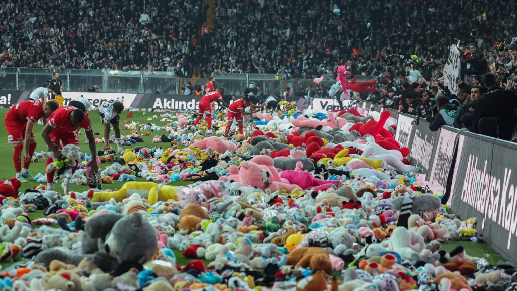 Os torcedores do Besiktas jogaram milhares de brinquedos de pelúcia no campo durante uma partida no domingo para doar às crianças afetadas pelo terremoto na Turquia e na Síria.