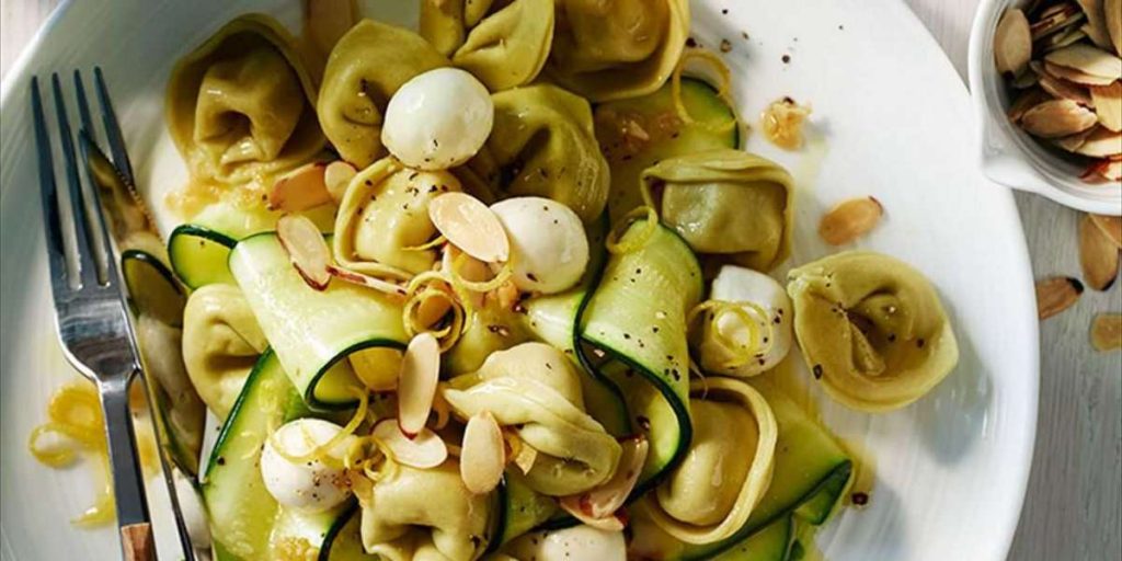 Tortelloni com abobrinha, amêndoas whey e queijo