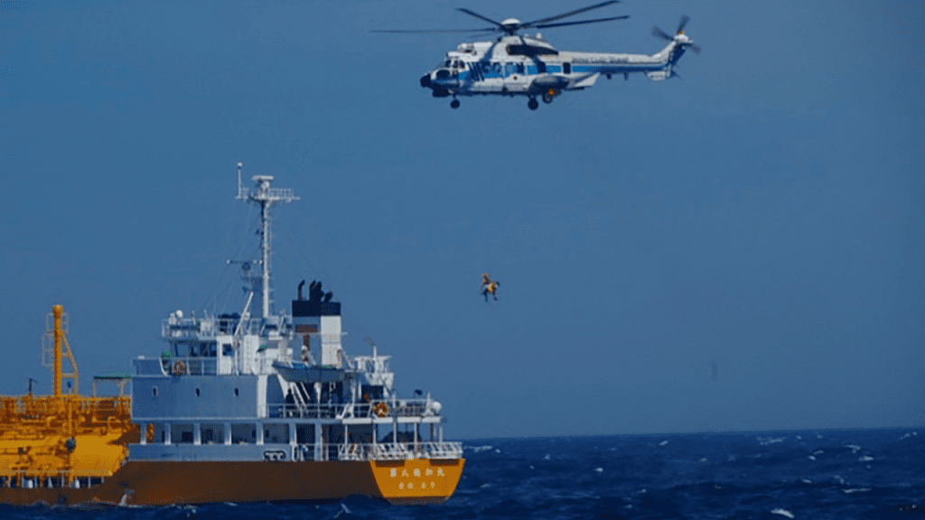 o Cargueiro O navio que avistou a mulher solicitou a ajuda de um navio-tanque de GLP, o Kakua Maru nº 8. Dois tripulantes pularam no mar e resgataram a mulher, disseram as autoridades. Eles acrescentaram que um helicóptero da Guarda Costeira a transportou para pousar.