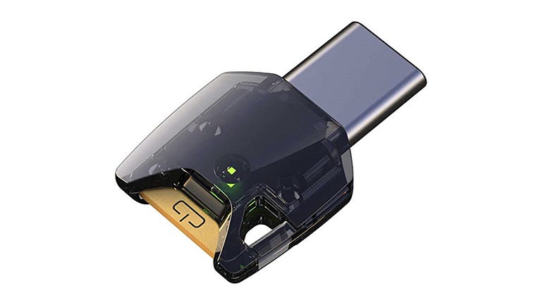 O Winkeo-C FIDO2 da Neowave é uma pequena chave de segurança compacta que também suporta a especificação FIDO U2F mais antiga que funciona com AWS, Dropbox, Facebook, GitHub, Gmail, GOV.UK, Okta, Salesforce, Twitter, Zoho e dezenas de outros sites e serviços. É pequeno o suficiente para ficar na porta USB do seu laptop na maior parte do tempo, embora não fique nivelado o suficiente para que você necessariamente queira deixá-lo no lugar quando o estiver carregando em uma bolsa (o orifício do cordão torna é fácil colocar um chaveiro para transportar embora). Também descobrimos que ele se encaixa muito bem nas portas USB-C em vários dispositivos de teste, então você precisa puxar com bastante força para extraí-lo.