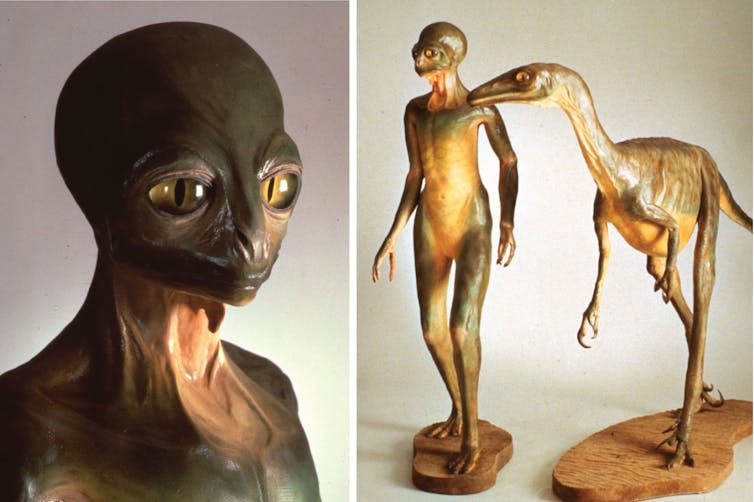 1980’lerde paleontolog Dale Russell, et yiyen bir dinozorun akıllı bir alet kullanıcısına dönüştüğü bir düşünce deneyi önerdi. Bu “dinozauroid” büyük beyinliydi, karşıt baş parmakları vardı ve dik yürüyordu.