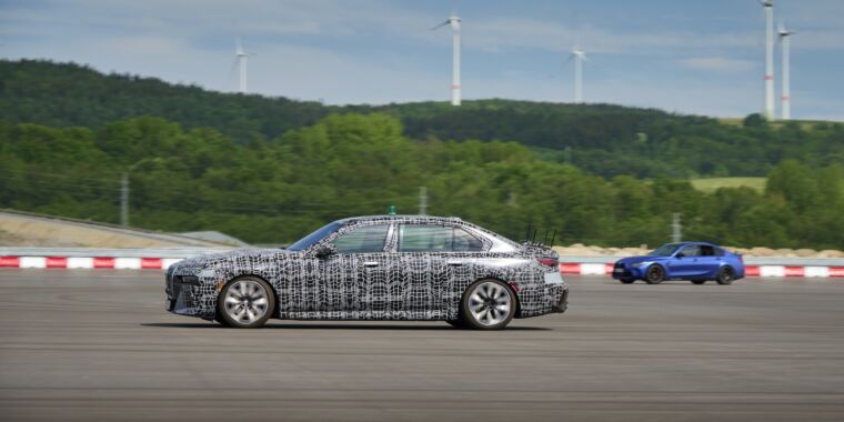 Os veículos fazem tudo isso fisicamente em uma área de testes nas instalações de testes da BMW em Sokolov, na República Tcheca, mas também virtualmente em pistas, rodovias e ruas da cidade. É uma paisagem de itens virtuais; então, se algo der errado e um carro “bater” em alguma coisa, na verdade não bateu em nada.